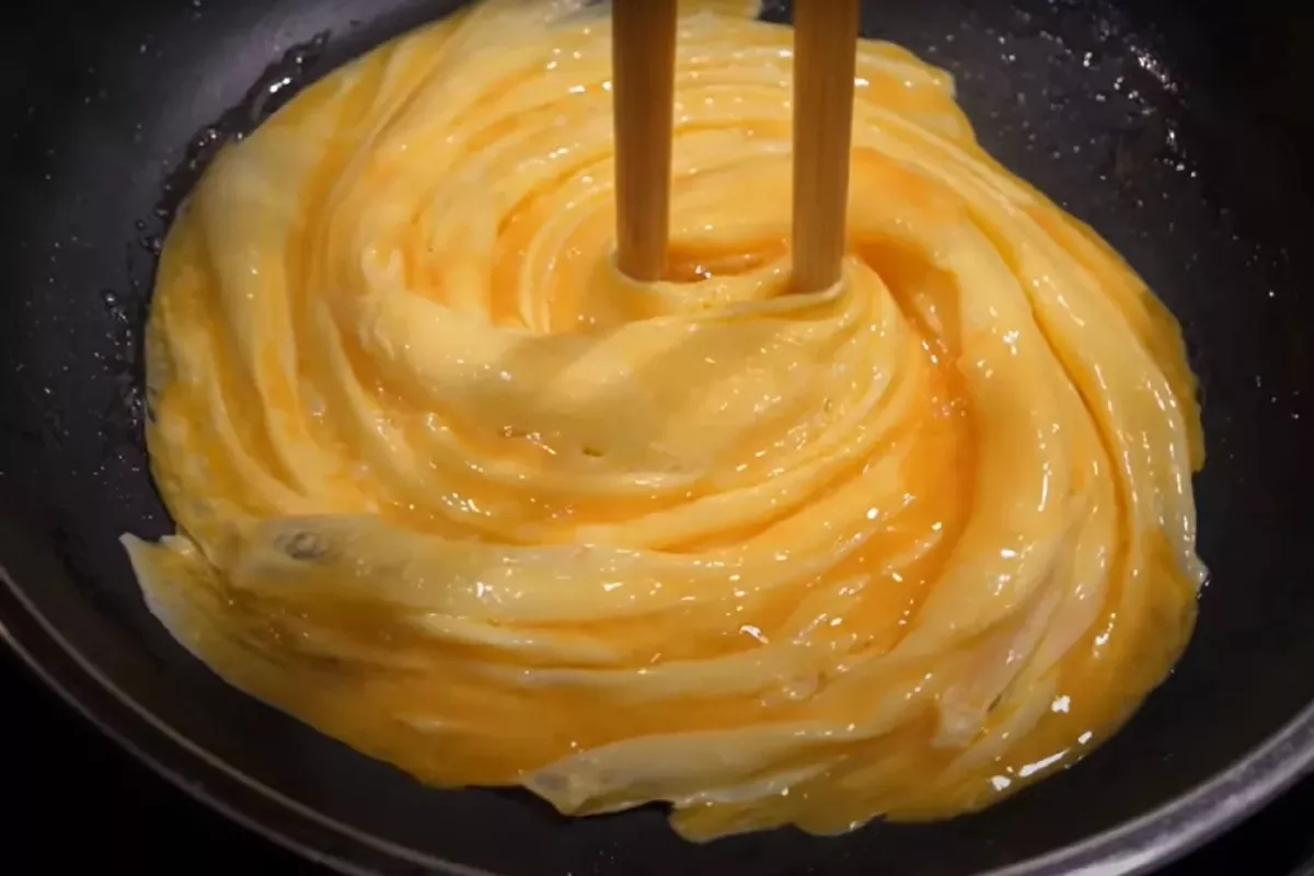 Cosas a tener en cuenta: necesitarás un par de palillos y una sartén bien engrasada o antiadherente. La tortilla tornado se cocina a fuego medio-alto, por lo que una fuente de calor de placa de inducción permite controlar el calor con facilidad, aunque también puedes utilizar fogones de gas.