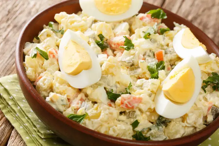 Pocos ingredientes, pero mucho sabor y practicidad. Mezcla patatas y zanahorias hervidas y cortadas en cubos con atún en conserva en aceite de oliva, guisantes y aceitunas. Añade mayonesa, huevos duros picados y pimientos cortados en tiras. Para que sea práctica de transportar, puedes ponerla en un recipiente hermético.