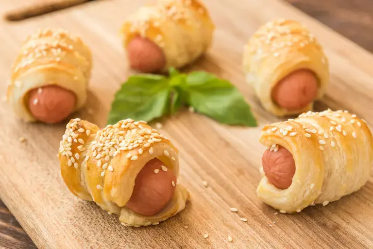 Clásicos de cualquier aperitivo, también se prestan a los picnics al aire libre. Para un relleno bien sabroso, mezcla 12 salchichas (sin la piel) con pan desmigajado, leche, sal, hierbas provenzales y mostaza. Extiende una lámina rectangular de hojaldre, córtala en tres tiras a lo ancho y extiende una tira de relleno en el extremo más largo de cada una. Pincela con huevo la parte opuesta al relleno, enrolla y corta cada cilindro en rodajas pequeñas. Hornea unos 25 minutos o hasta que se doren.