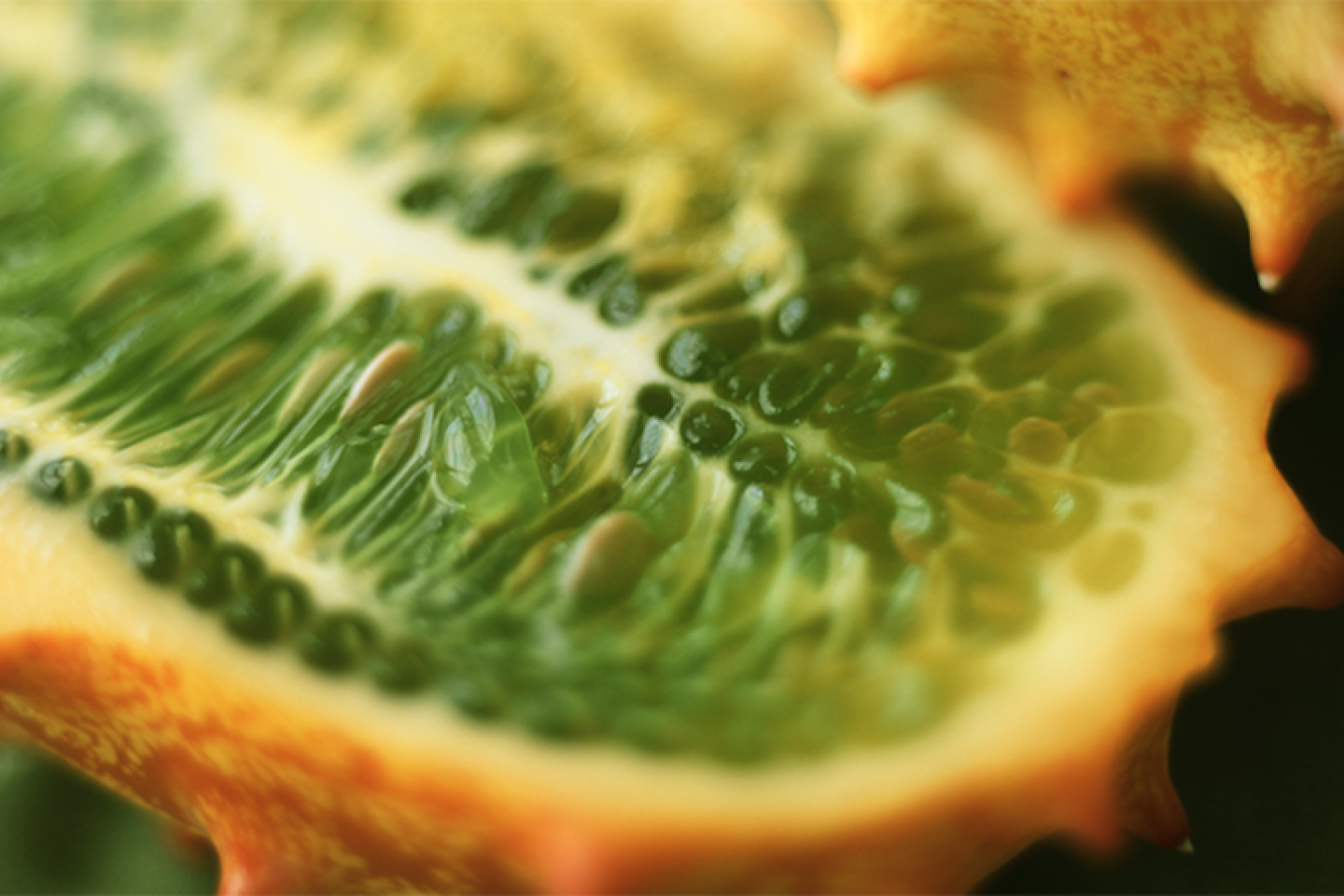Si os estáis preguntando qué es esta fruta extraña de color amarillo anaranjado, llena de pequeños cuernos, la respuesta es que se trata del kiwano.