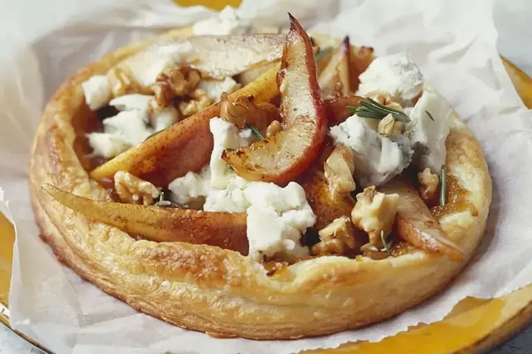 Saborea un reconfortante brunch perfecto para toda la familia. Disfruta de la sencillez de una tarta de pera adornada con cebollas caramelizadas y cremoso queso Gorgonzola. Este plato fácil de preparar promete una armoniosa mezcla de sabores dulces y salados, dando lugar a una experiencia culinaria mágica.