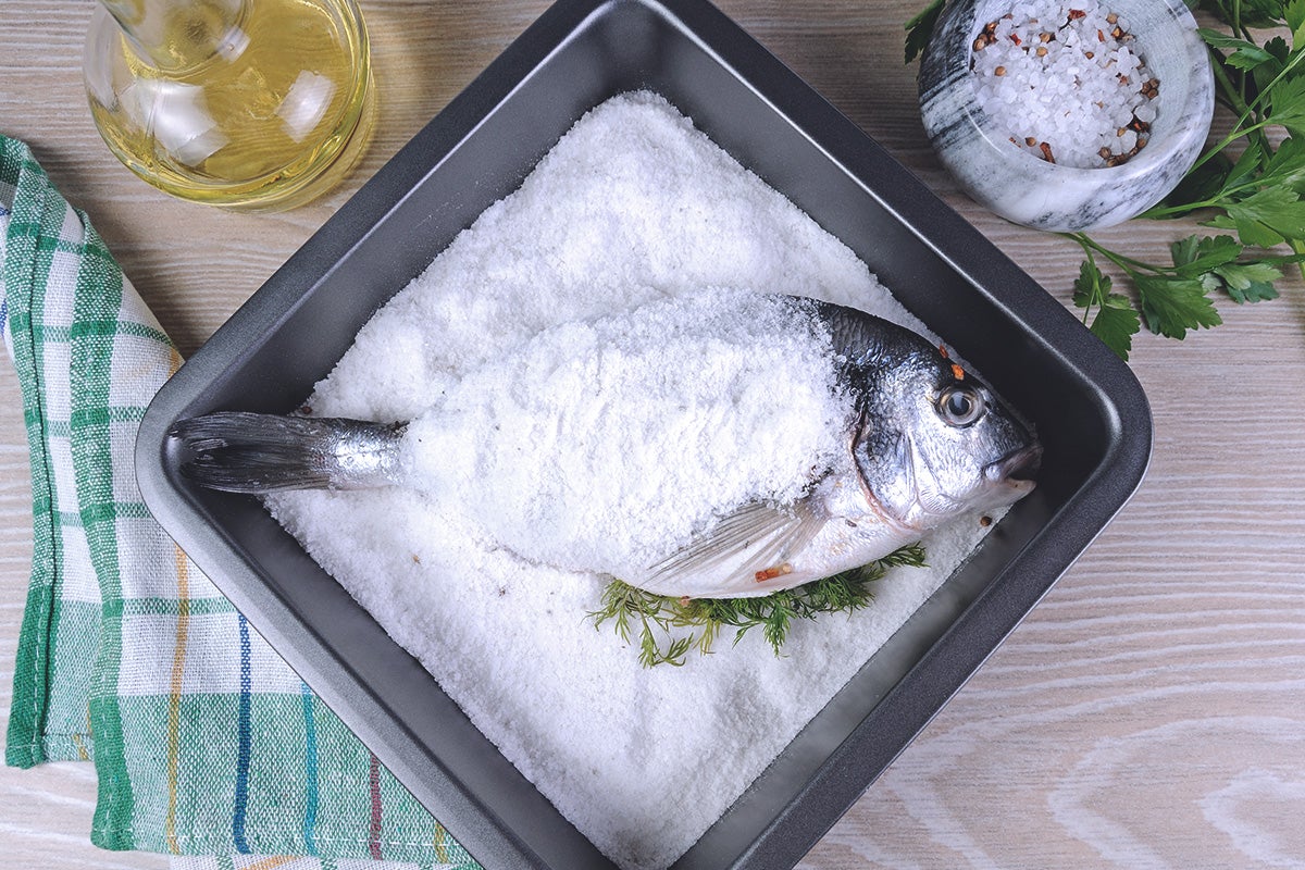 Lo primero que se debe hacer para lograr obtener un buen resultado utilizando esta técnica de cocción es utilizar sal gruesa, conocida también como sal gorda. Actualmente, existen sales especiales a las cuales recurrir en este tipo de recetas que también se pueden usar, pero en definitiva, lo que seguro no debéis utilizar es sal fina.