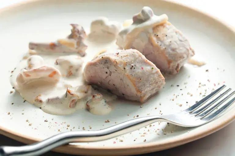 Solomillo de cerdo con salsa de trufa y puré de apionabo