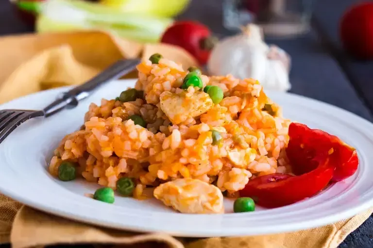 El arroz con pollo es una receta completa que puede disfrutarse tanto fría como caliente, y que puede adaptarse con los ingredientes más variados, al gusto. La receta que te proponemos aquí incluye arroz, pollo, guisantes, cebolla y pimientos, y queda muy bien condimentada con un toque de picante. Si prefieres una opción vegetal al pollo, puedes utilizar tofu o agregar lentejas u otra legumbre que te guste, y también puedes probar con diferentes tipos de arroz, que aportarán aromas y texturas distintas al plato.