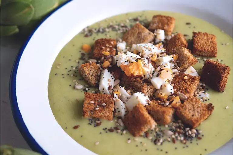 Otro alimento indispensable a la hora de pensar en sopas y cremas es la alcachofa. Un ingrediente lleno de propiedades nutritivas que serán muy beneficiosas para nuestra salud, por ser especialmente fuente de vitaminas, proteínas y fibra, entre otras. Además, es muy deliciosa en cualquiera de sus formas. En esta ocasión, os venimos a proponer una crema de alcachofas que os va a encantar y seguramente peleará por ser la estrella de la noche.