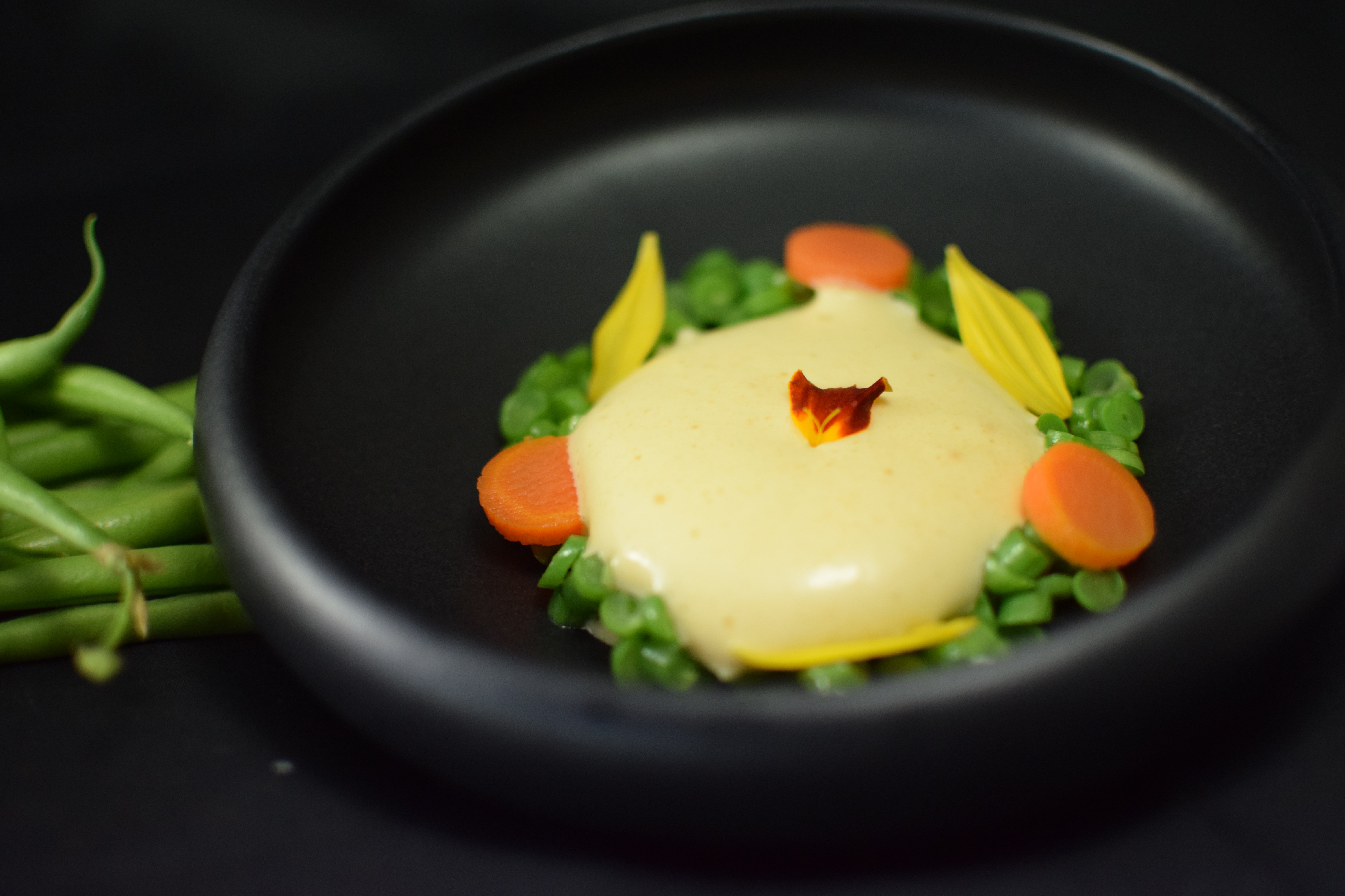 - En el centro del aro añadir la espuma de ajo y zanahoria y terminar decorando con la flor del tagete y los pétalos del girasol.