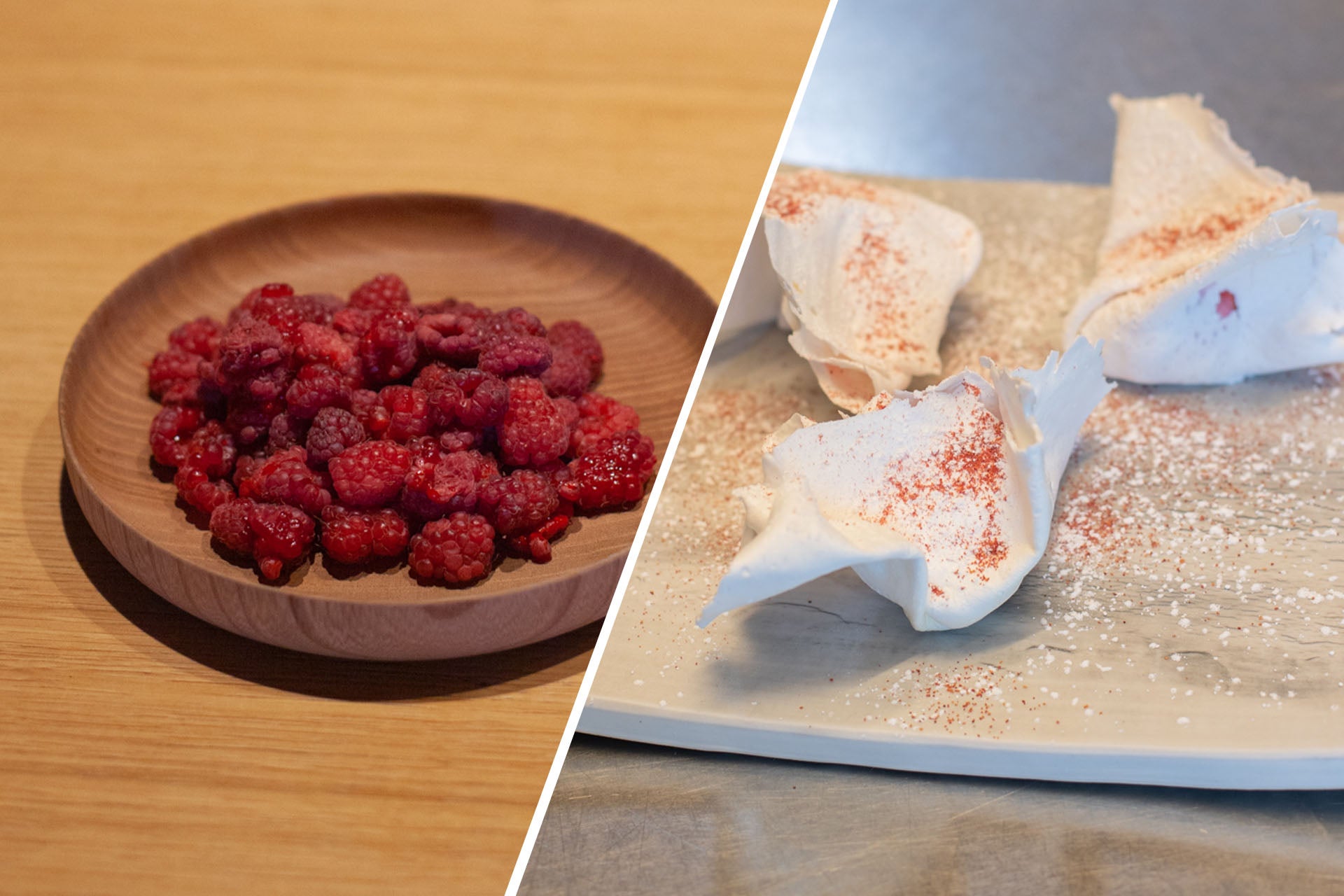 Poner en un plato, rematar con las frambuesas en polvo y esperar 5 minutos antes de servir, para que los cubitos de hielo no estén demasiado fríos.