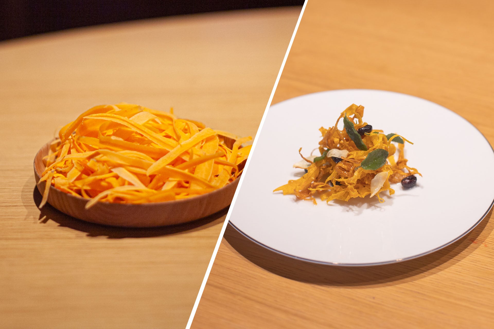Calentar la mantequilla clarificada a 130 ºC, y freír las peladuras de zanahoria hasta que queden doradas y crujientes. Escurrir y secar inmediatamente.