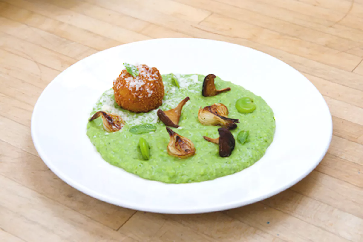 Risotto de habas y arancini, cebollas primavera y hongos Morel por el chef Phil Saneski