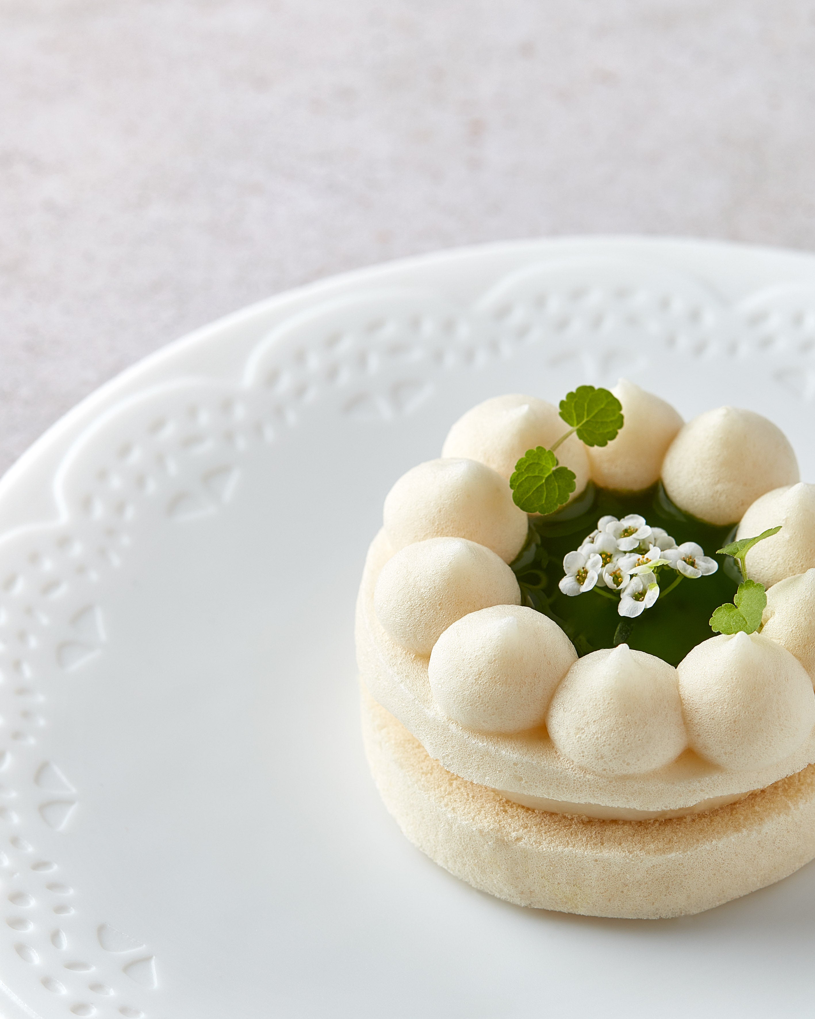 Acomodar un disco de helado entre las dos capas de merengue, tapar y en el centro de la tapa disponer el aceite de hoja de higuera.