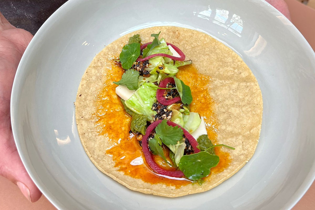 Tortilla de maíz con tallos de coliflor asados, pasta de brócoli fermentada, salsa matcha y pepinillos de Jez Wick y Lauren Evers