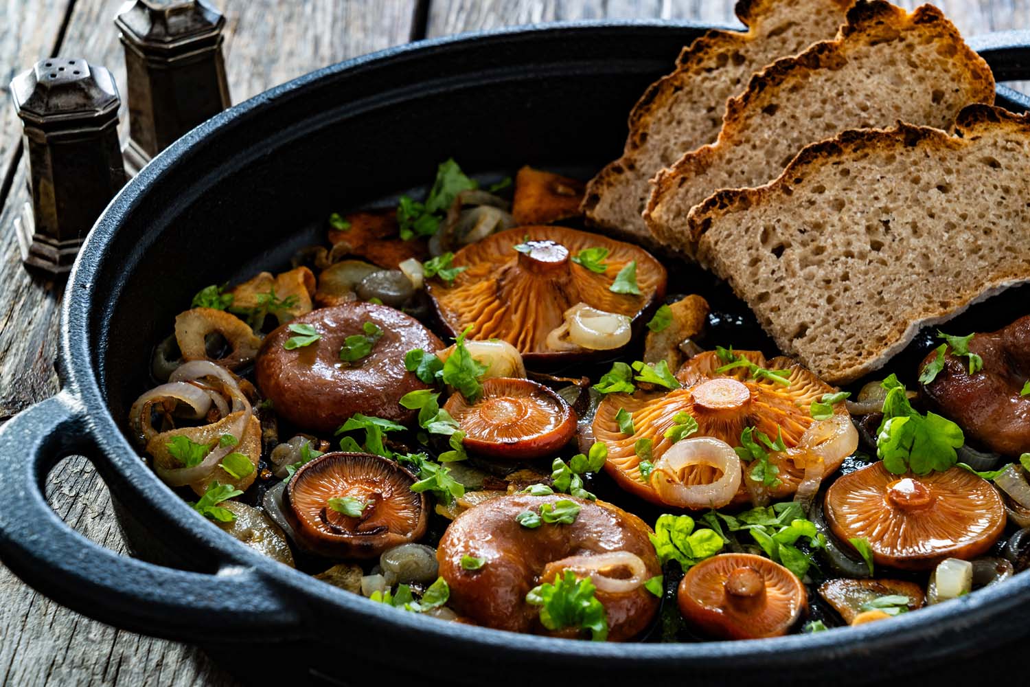 El momento de añadir la sal es clave: si lo haces al principio, la sal deshidratará la seta y podría hacer que quede dura. Por eso, añade la sal y la pimienta solo después de que los níscalos hayan soltado parte de su agua. Otra cosa que debes saber es que la seta es como una esponja, lo que significa que el mejor truco para limpiarla no es lavarla, sino cepillarla con un cepillo pequeño y utilizar un paño húmedo para quitar la tierra. Si fuera necesario pasarlas por debajo del grifo, procura secarlas enseguida y muy bien. Si buscas un sabor más intenso y un toque de acidez, añade vino blanco, o bien caldo casero de pollo verduras para obtener un sabor más suave y un poco más de jugo para mojar pan.